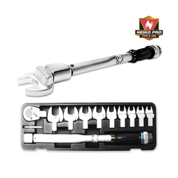 Interchangeable heads permit ratcheting, fixed, or open end torquing capability with adjustable torque wrench bodies.