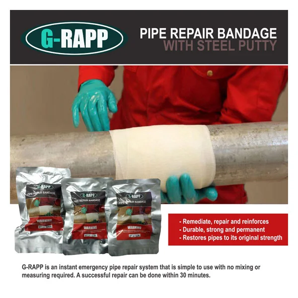 Repairs leak in 30 minutes Applicable to pipes up to 18″ (457 mm) diameter Applicable on any metal or non-metal pipes Repairs T-joint, elbow joint, valve thread, valve body Withstand pressure up to 400 psi (28 kg/cm2) Withstand temperature up to 200 °C (392 °F) Safe for drinking water and resistant to most chemicals Reinforce and strengthen pipe after repair Permanent repair and extend service life of pipes.