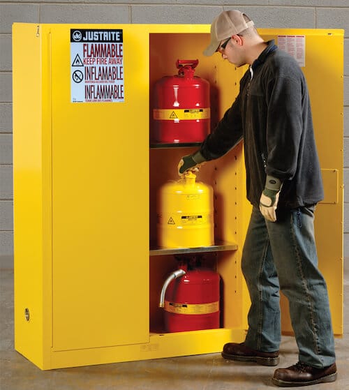 Hazardous materials storage requires special handling and special containers. Chances are your business has a number of hazardous chemicals on-site—like gasoline, cleaning supplies and paint thinner – all of which require their own special safe storage solutions. Whether you’re storing gas, oil or acid, SHIN has your storage solution. You can even make the storage of these materials safer by placing the safe storage containers inside safety cabinets or lockers, also available from SHIN.